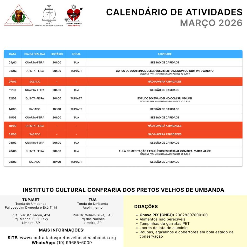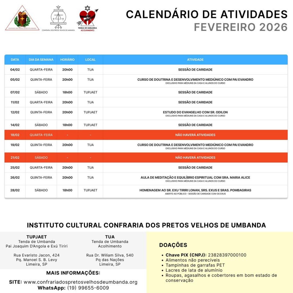 ANTES DE VISITAR NOSSA CASA CONHEÇA NOSSAS DIRETRIZES GERAIS: Acesse: https://confrariadospretosvelhosdeumbanda.org/diretrizes-gerais/ Maiores informações: (19) 99655-6009 whatsapp ACEITAMOS DOAÇÕES PARA NOSSOS TRABALHOS SOCIAIS: alimentos não-perecíveis (serão utilizados em cestas básicas para …