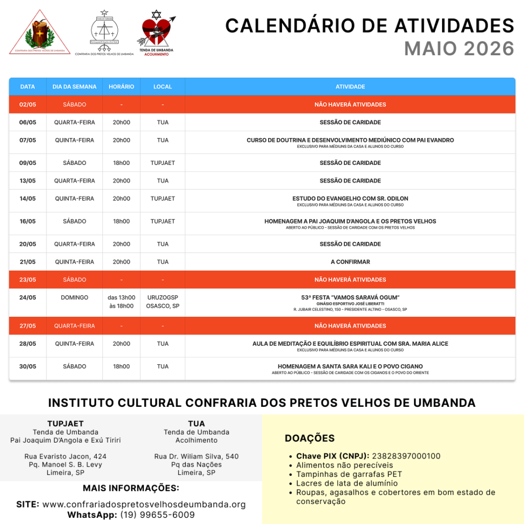 ANTES DE VISITAR NOSSA CASA CONHEÇA NOSSAS DIRETRIZES GERAIS: Acesse: https://confrariadospretosvelhosdeumbanda.org/diretrizes-gerais/ Maiores informações: (19) 99655-6009 (WhatsApp) ACEITAMOS DOAÇÕES PARA NOSSOS TRABALHOS SOCIAIS: Alimentos não-perecíveis (serão utilizados em cestas básicas para …