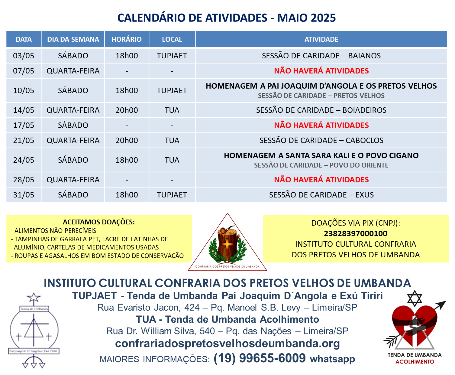 CALENDÁRIO DE ATIVIDADES E CURSOS – MAIO 2025Por Vinicius Santos / 1 de maio de 2025 / Calendário de Atividades A partir do mês de março de 2025, passamos a divulgar também o calendário de cursos do Instituto Cultural Confraria dos Pretos Velhos de Umbanda.ATENTEM-SE! Os cursos são apenas para os médiuns da casa.Segue a programação dos cursos para esse mês: