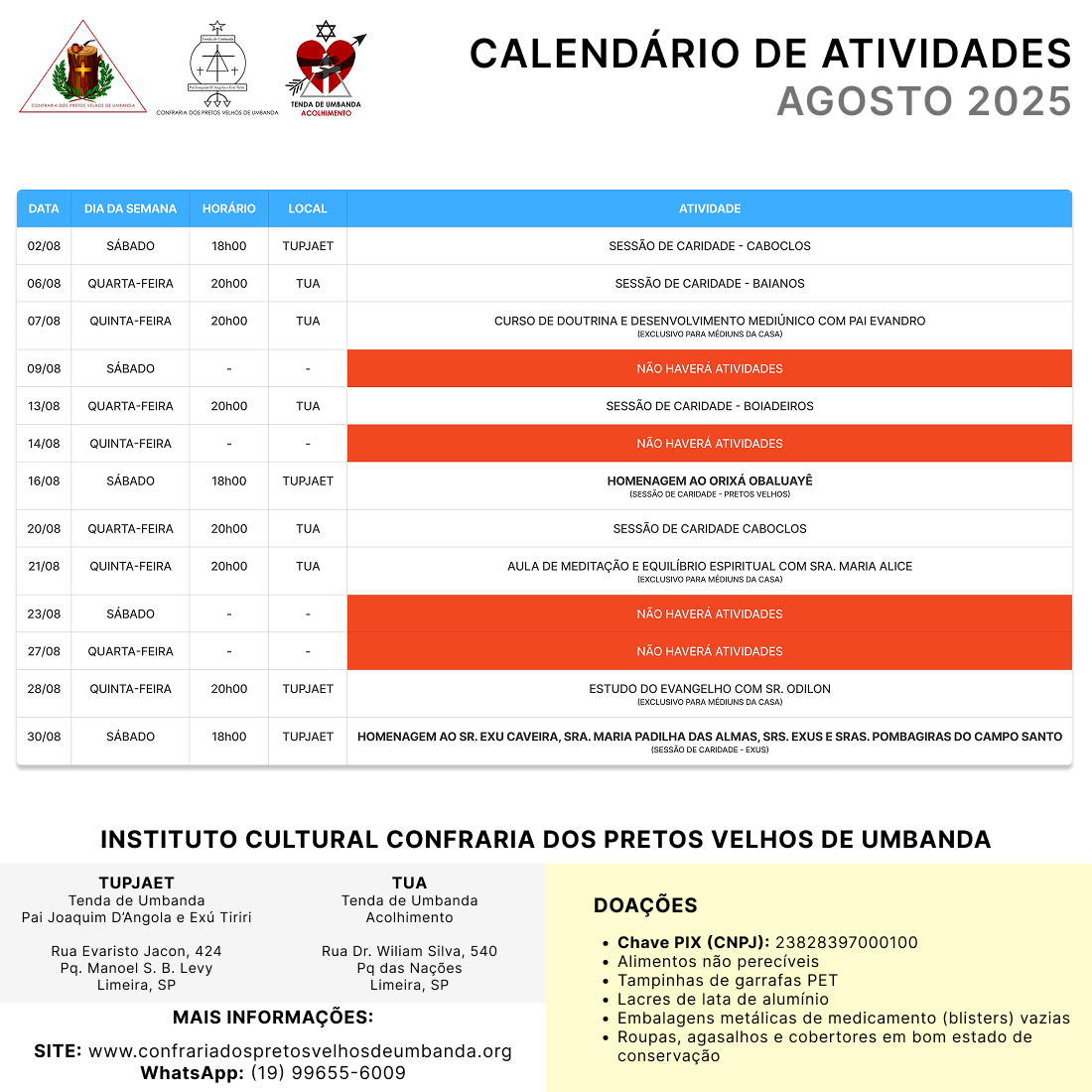 A partir do mês de março de 2025, passamos a divulgar também o calendário de cursos do Instituto Cultural Confraria dos Pretos Velhos de Umbanda.