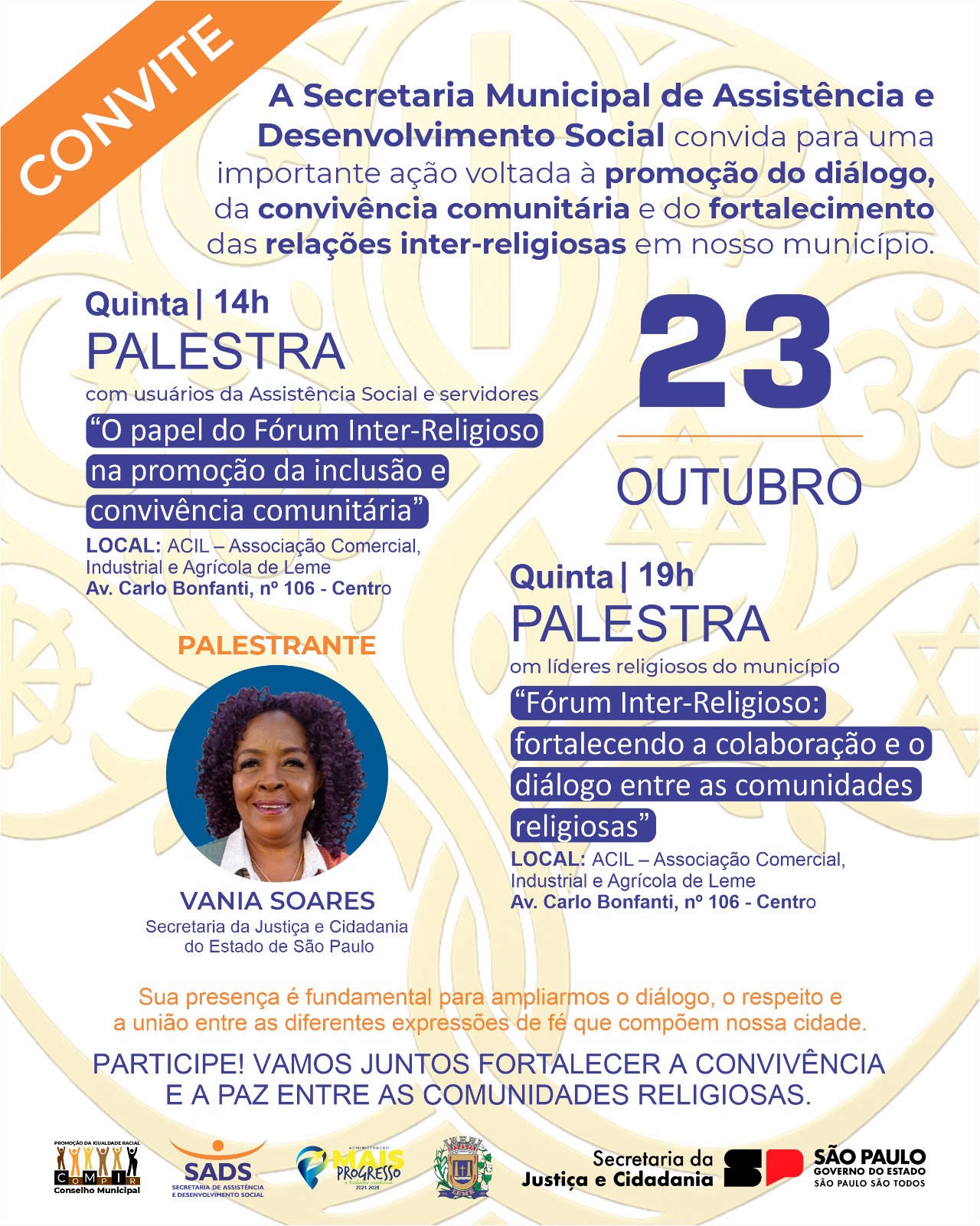 Pai Evandro, representando a Confraria dos Pretos Velhos de Umbanda, participou de um evento organizado pela Secretaria Municipal de Assistência e Desenvolvimento Social em Leme palestrado pela Profa. Vânia Soares, coordenadora do Fórum Inter-Religioso para uma Cultura de Paz e Liberdade de Crença da Secretaria da Justiça e Cidadania do Estado de São Paulo, com a importante ação voltada à promoção do diálogo, da convivência comunitária e do fortalecimento das relações inter-religiosas.