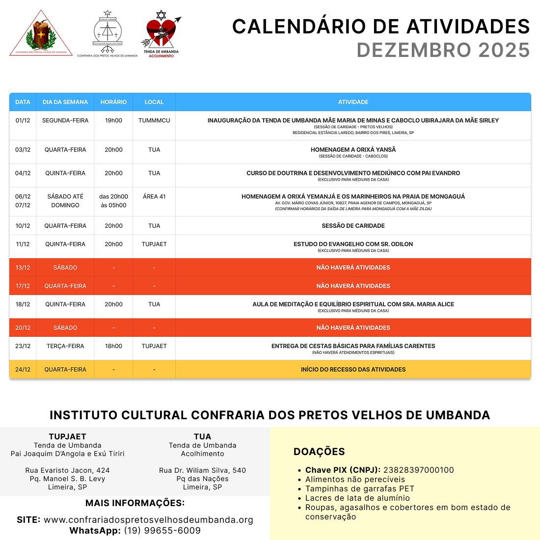 • DOAÇÕES EM DINHEIRO PODEM SER FEITAS PELO PIX: CNPJ 23828397000100 INSTITUTO CULTURAL CONFRARIA DOS PRETOS VELHOS DE UMBANDA.