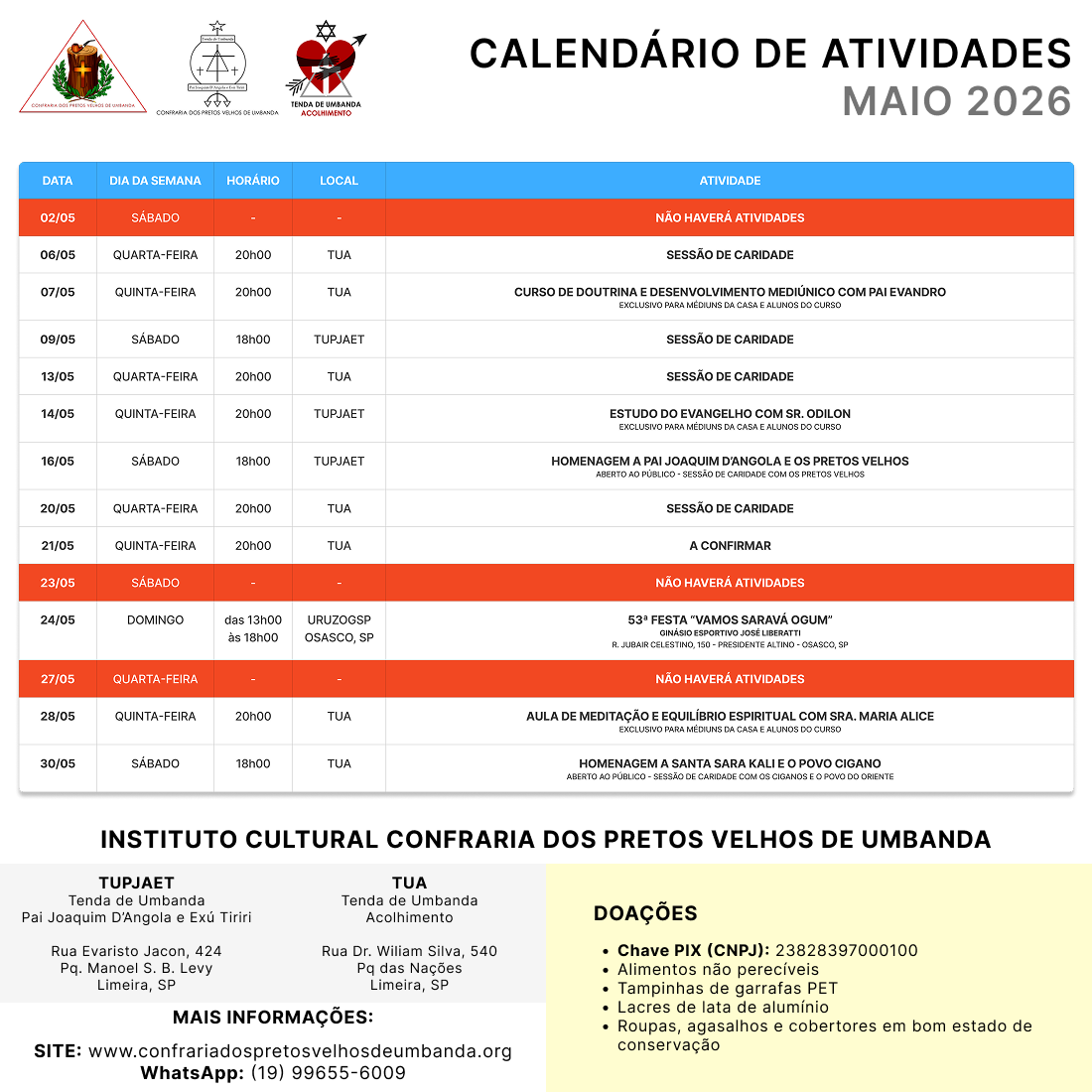 - DOAÇÕES EM DINHEIRO PODEM SER FEITAS PELO PIX: CNPJ 23828397000100 – INSTITUTO CULTURAL CONFRARIA DOS PRETOS VELHOS DE UMBANDA.